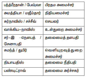 சிவாஜி எட்டு அமைச்சர்களைக் கொண்ட குழுவிற்கு அஷ்டபிரதான் எனப் பெயரிட்டார். ஒவ்வொருவரும் ஒரு முக்கிய துறையைக் கொண்டிருந்தனர். மராத்தியப் பேரரசில் பேஷ்வா என்பவர் நவீனகால பிரதமருக்கு இணையானவர். உண்மையில் இவர்கள் சத்திரபதிகளுக்குத் துணையதிகாரிகளாய் இருந்தவர்களாவர். ஆனால் காலப்போக்கில், குறிப்பாக, ஷாகு மகாராஜாவின் காலத்திலிருந்து பேஷ்வாக்கள் உண்மையான மராத்திய அரசர்களாயினர் சத்திரபதிகள் பெயரளவிற்கான அரசர்கள் என்னும் நிலைக்குத் தள்ளப்பட்டனர்.