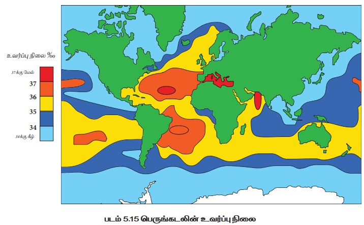 உலக வரைபடத்தில் அதிக உவர்ப்பியமும், குறைவான உவர்ப்பியமும் கொண்டுள்ள பெருங்கடல் பகுதிகளைக் கண்டறிக.