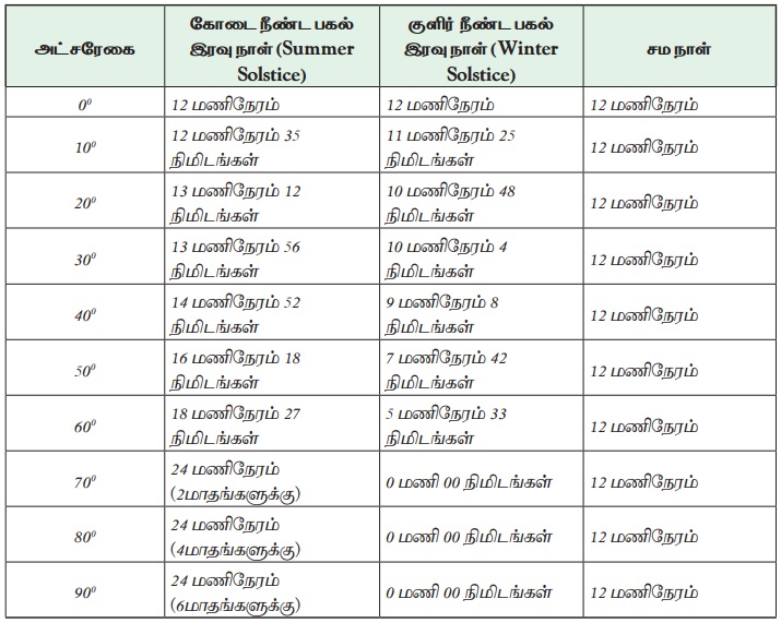 மேலே கொடுக்கப்பட்ட அட்டவணையிலிருந்து (அட்டவணை2.2) நிலநடுக்கோட்டு பகுதியில் மட்டுமே ஆண்டு முழுவதும் 12 மணி நேரம் பகல் இரவு இருக்கும் என்பது தெளிவாகத் தெரிகிறது. நிலநடுக்கோட்டிலிருந்து விலகி செல்லும் போது பகல் நேர வேறுபாடு அதிகரிக்கிறது. இந்த பருவகால மாற்றங்களால் பகல் நேர வேறுபாடு துருவ பிரதேசங்களில் மிக அதிகமாக இருக்கும்.