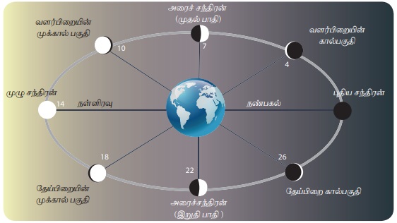 புவி, சந்திரன், மற்றும் சூரியனுக்கு இடையில் மாறும் கோணங்கள் சந்திரனின் வளர்ச்சி நிலையை நிர்ணயிக்கின்றன. சந்திரனின் நிலையானது ஒவ்வொரு மாதமும் 'அமாவாசை' அன்றிலிருந்து ஆரம்பிக்கிறது (படம் 2.16). அதன்பிறகு சந்திரனின் ஒருசிறிய பகுதி மட்டுமே ஒளிர்கிறது. இதற்கு "பிறைச்சந்திரன்" (Crescent) என்று பெயர். இந்த பிறைச்சந்திரன் முதல் கால் சந்திரனாக உருவாகிறது. அதிகரிக்கும் ஒளியுடன் மூன்றாவது கால் நிலைக்கு வளர்ந்து வருவதை முக்கால்பகுதி எனவும் பிறகு முழுசந்திரனாகவும் மாறுகிறது. இது பௌர்ணமி என அழைக்கப்படுகிறது. பௌர்ணமிக்குப் பின் சந்திரன் தேய்ந்து அல்லது மறைந்து முக்கால் சந்திரன், கடைசிகால் சந்திரன், பிறைச் சந்திரன் மற்றும் முழுவதும் மறைந்து போய் காண முடியாத கருப்பு அமாவாசை சந்திரனாக மாறிவிடுகிறது.