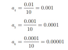 இங்கு ஒவ்வோர் உறுப்பும் முந்தைய உறுப்பை 10 ஆல் வகுக்கக் கிடைக்கிறது. எனவே அடுத்த மூன்று உறுப்புகள்