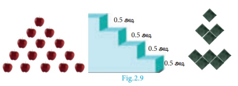 இந்தப் படங்களில் ஏதோ ஓர் அமைப்பு அல்லது வரிசைப்படுத்துதல் உள்ளது. முதல் படத்தில், முதல் வரிசையில் ஓர் ஆப்பிள். இரண்டாவது வரிசையில் இரண்டு ஆப்பிள்கள் மூன்றாவது வரிசையில் மூன்று ஆப்பிள்கள் என்றவாறு அமைந்துள்ளன. ஒவ்வொரு வரிசையிலும் உள்ள ஆப்பிள்களின் எண்ணிக்கை 1, 2, 3, ...