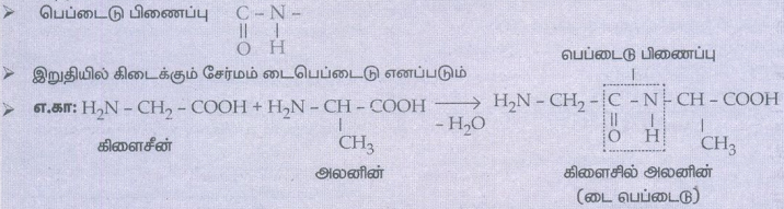 • இந்த அமைடு பிணைப்பானது பெப்டைடு பிணைப்பு எனப்படும். பெப்டைடு பிணைப்பு