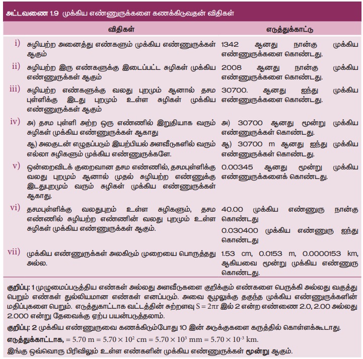 இயற்பியல் அளவீடு ஒன்றில் பொருளின் நீளம் l= 1230 m, எனில் இதன் முக்கிய எண்ணுறு 4 ஆகும். முக்கிய எண்ணுருக்களை கணக்கிடுவதின் விதிகள் அட்டவணை 1.9-இல்கொடுக்கப்பட்டுள்ளன.