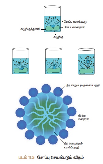 சோப்பின் முனைவற்ற பகுதி அழுக்கைச் சுற்றிக் கொள்கிறது (படம் 11.3). சோப்பின் கார்பாக்ஸிலேட் பகுதி, கொத்துகளை நீரில்