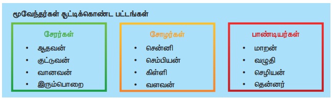 • மூவேந்தர்கள் எனும் சேர, சோழ, பாண்டிய அரசர்களின்