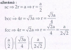 18. Sc, bcc, மற்றும் fcc ஆகிய கனச்சதுர அமைப்புகளின் விளிம்ப, நீளத் தினை 'a' 'எனக் குறிப்பிட்டால் அவ்வமைப்புகளில் காணப்படும் கோளங்களின் ஆரங்களின் விகிதங்கள் முறையே