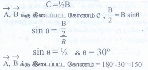 12. A மற்றும் B வெக்டர்களின் தொகுபயன் வெக்டர், A வெக்டருக்கு செங்குத்தாக உள்ளது. மேலும் தொகுபயன் வெக்டரின் எண்மதிப்பு B வெக்டரின் எண்மதிப்பில் பாதியாக உள்ளது எனில், A மற்றும் B வெக்டர்களுக்கு இடைப்பட்ட கோணத்தின் மதிப்பு என்ன?