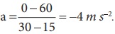 மேலும் துகள் 15 வினாடியிலிருந்து 30 வினாடி வரை மாறாத எதிர்க்குறி சாய்வினைக் கொண்டுள்ளது. இந்நிகழ்வில் v2 = 0 மற்றும் v1 = 60ms-1. எனவே t = 20 வினாடியில் முடுக்கமானது எதிர்க்குறி சாய்வானது துகளின் எதிர் முடுக்கத்தைக் காட்டுகிறது.