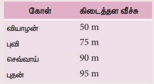 11. பின்வரும் அட்டவணை வெவ்வேறு கோள்களில் எறியப்பட்ட எறிபொருள் அடைந்த கிடைத்தள நெடுக்கத்தினைக் காட்டுகிறது. அனைத்து பொருட்களும் ஒரே கிடைத்தள கோணத்துடனும் சம ஆரம்பத்திசை வேகத்துடனும் எறியப்பட்டுள்ளன. இவ்விவரங் களிலிருந்து மிக அதிக மற்றும் மிகக் குறைந்த ஈர்ப்பு முடுக்கமுடைய கோள்களைக் கண்டுபிடி. மேலும் கோள்களை அவற்றின் ஈர்ப்பு முடுக்கத்தின் (g) அடிப்படையில் ஏறுவரிசையில் அமைக்கவும்.
