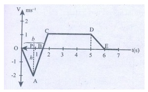 8. நேர்குறி x அச்சுத்திசையில் இயங்கும் துகளொன்றின் திசைவேகம் - நேரம் வரைபடம் காட்டப்பட்டுள்ளது. 0 விலிருந்து 7 வினாடி வரை உள்ள கால இடைவெளியில் அத்துகளின் இயக்கத்தினைப் பகுப்பாய்வு செய்க. மேலும் 0 முதல் 2 வினாடி வரை துகள் அடைந்த இடப்பெயர்ச்சி மற்றும் அத்துகள் கடந்த தொலைவு ஆகியவற்றைக் கணக்கிடுக.
