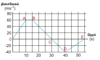 (இ) திசைவேகம் - நேரம் வரைபடத்தின் சாய்வு துகளின் முடுக்கத்தைக் கொடுக்கும். முதல் 10 வினாடிகளுக்கு திசை வேகம் மாறாத சாய்வினைக் கொண்டுள்ளது (மாறாத முடுக்கம்)
