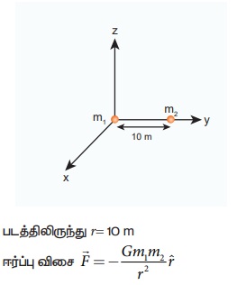 படத்தில் காட்டியுள்ளபடி, 10 மீ தொலைவில் நிறைகள் m1 மற்றும் m2 அமைந்துள்ளன. இரு நிறைகளுக்கும் இடையேயான ஈர்ப்பியல் விசையை கணக்கிடுக. ஒவ்வொரு நிறையின் மீது செயல்படும் விசையின் திசையினை வரைக. (m1= 1 kg; m2 = 2 kg)