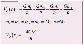 (ஆ) நான்கு நிறைகளாலும் புள்ளி O வில் ஏற்படும் ஈர்ப்பு தன்னிலை ஆற்றல் ஆகியவற்றைக் கணக்கிடுக.
