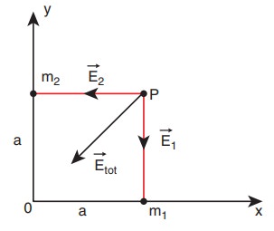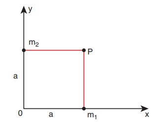 (a) நிறைகள் m1, மற்றும் m2 முறையே x மற்றும் y அச்சுகளில் ஆதியிலிருந்து ‘a’ தொலைவில் வைக்கப்பட்டுள்ளன. படத்தில் காட்டப்பட்டுள்ள புள்ளி P யில் ஈர்ப்பு புலச்செறிவு காண்க.