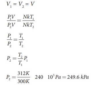 8 km தொலைவிலிருந்து மிதிவண்டியின் மூலம் பள்ளிக்கு வரும் மாணவியின், மிதிவண்டியின் சக்கரத்தின் காற்றழுத்தம் 27°C இல் 240 kPa. அம்மாணவி பள்ளியை அடைந்தவுடன் சக்கரத்தின் வெப்பநிலை 39°C எனில் சக்கரத்தின் காற்றழுத்தத்தின் மதிப்பினைக் காண்க.