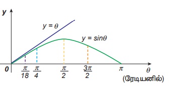 அதாவது θ வானது 10 டிகிரி மற்றும் அதைவிட குறைவாக இருக்கும்போது, θ வை ரேடியனில் குறிப்பிட்டால் sin θ வானது θ வுக்கு சமம். θ அதிகரிக்கும் பொழுது sine θ மதிப்பானது θ விலிருந்து படிப்படியாக வேறுபடுகிறது.