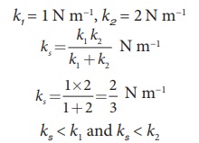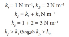 1Nm-1 மற்றும் 2Nm-1 சுருள் மாறிலிகள் கொண்ட இரு சுருள்வில்கள் தொடரிணைப்பில் இணைக்கப்படுவதாக கொள்வோம். இவ்வமைப்பின் தொகுபயன் சுருள்மாறிலியைக் (ks) கணக்கிடுக. மேலும் ks, ஐ பற்றி கருத்து கூறுக.