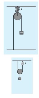 6. கீழ்க்காணும் அமைப்பில் நிறை M ஆனது சமநிலைப்புள்ளியிலிருந்து செங்குத்தாக கீழ்நோக்கி சிறிது இடம் பெயர்ச்சி செய்து பின் விடப்பட்டால் அலைவு நேரத்திற்கான சமன்பாட்டை கணக்கிடுக. (கப்பி மெல்லியது மற்றும் உராய்வற்றது மேலும் கம்பியும் சுருள்வில்லும் லேசானது)