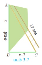 செங்கோண முக்கோணம் ABC, AC = 17 அடி BC = (x - 7) அடி
