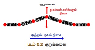 குறுக்கலையில் துகள்கள் அதிர்வுறும் திசையானது, அலை பரவும் திசைக்குச்