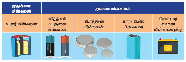 1. மின்கலன்களின் வகைகள் – முதன்மை மின்கலன்கள் மற்றும் துணை மின்கலன்கள்