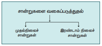 • சான்றுகள் முதல்நிலைச் சான்றுகள், இரண்டாம் நிலைச்சான்றுகள் என வகைப்படுத்தப்படுகின்றன.