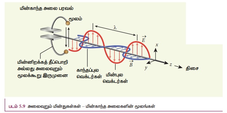 வெக்டர் என்று பெயர்) மின்காந்த அலை பரவும் திசையினைக் காட்டுகிறது.