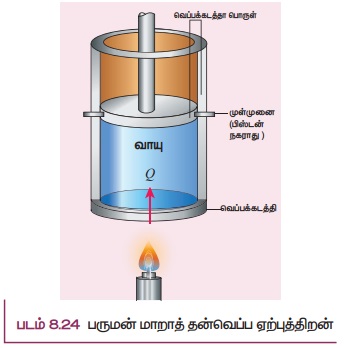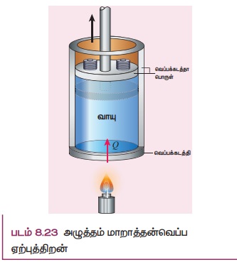 அழுத்தம் மாறா நிலையில் 1 kg நிறையுடைய பொருளின் வெப்பநிலையை 1 K அல்லது 1°C உயர்த்தத் தேவைப்படும் வெப்பத்தின் அளவு அழுத்தம் மாறாத்தன்வெப்ப ஏற்புத்திறன் என அழைக்கப்படும். அமைப்பினை வெப்பப்படுத்தும்போது வாயுவிற்கு வெப்பம் அளிக்கப்படுகிறது. படம் 8.23 இல் காட்டியுள்ளவாறு மாறா அழுத்தத்தில் வாயு விரிவடைகிறது.