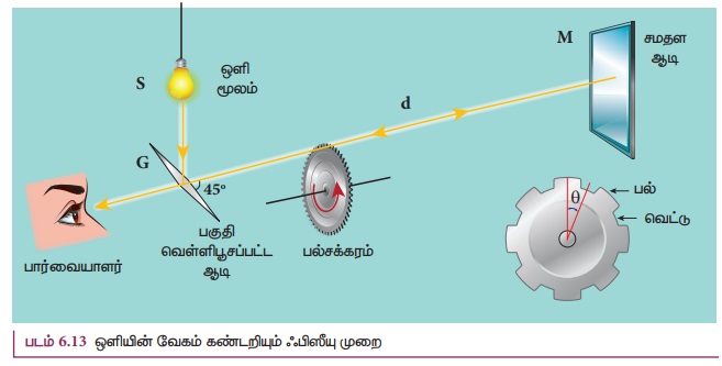 ஒளியின் வேகத்தைக் கண்டறிவதற்கான ஆய்வுக் கருவி படம் 6.13 இல் காட்டப்பட்டுள்ளது. ஒளிமூலம்