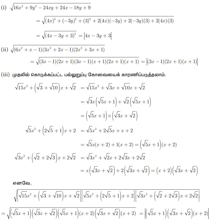 காரணிப்படுத்துதல் முறை, எடுத்துக்காட்டு, தீர்வு | கணக்கு - பல்லுறுப்புக் கோவையின் வர்க்க மூலம் | 10th Mathematics : UNIT 3 : Algebra