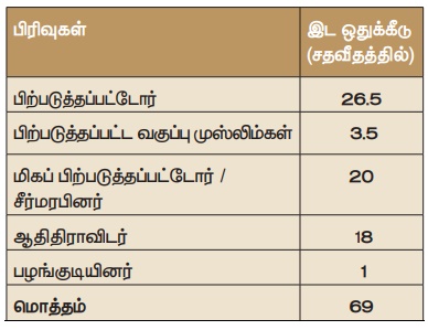 கொடுக்கப்பட்டுள்ள அட்டவணை மூலம் தமிழ்நாட்டின் பல்வேறு வகுப்பினர்களுக்கு வழங்கப்பட்டுள்ள இட ஒதுக்கீட்டினைப் பற்றி தெளிவாக புரிந்துகொள்ள இயலும்.