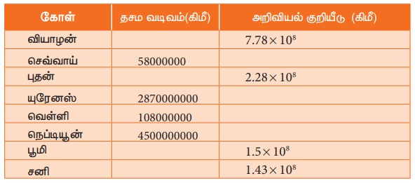 கதிரவனிலிருந்து கோள்களுக்கு உள்ள சராசரித் தொலைவு பின்வருமாறு பட்டியலில் கொடுக்கப்பட்டுள்ளது. விடுபட்ட மதிப்புகளை உரிய வடிவில் எழுதுக. மேலும், கோள்களுக்கு உள்ள தொலைவின் அளவுகளைக் கதிரவனுக்கு அருகிலிருந்து வரிசைப்படுத்துக.