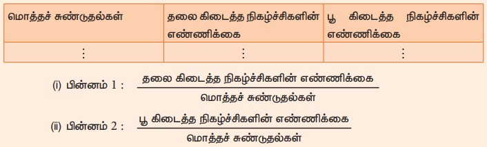 (i) பின்னம் 1 : தலை கிடைத்த நிகழ்ச்சிகளின் எண்ணிக்கை / மொத்தச் சுண்டுதல்கள்