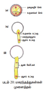 காணலாம். சில மகரந்தத்துகள் முளைக்க ஆர்ம்பித்திருக்கும் போது மற்றவை (குழல் உட்கரு
