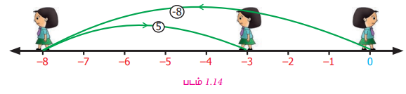 (-5) ஐக் குறிப்பதற்கு 5 அலகுகள் பின்னோக்கி நகர வேண்டும். தற்போது அடைந்த நிலை -3. அதாவது (-8) - (-5) = (-3).