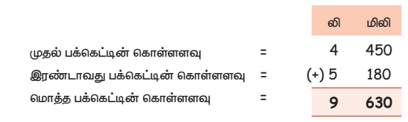 சர்மாவின் குடும்பத்திடம் 2 பக்கெட்டுகள் இருந்தன. ஒரு பக்கெட்டின் கொள்ளளவு 4 லி 450 மிலி மற்றொன்று 5 லி 180 மிலி ஆகும். இரண்டு பக்கெட்டுகளின் கொள்ளளவு எவ்வளவு?