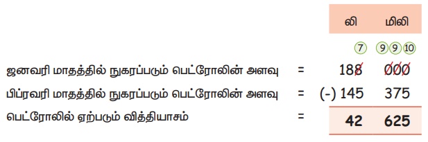 ஒரு மோட்டார் கார் ஜனவரி மற்றும் பிப்ரவரி மாதத்தில் 188 லி மற்றும் 145 லி 375 மிலி பெட்ரோலை நுகர்கிறது. பெட்ரோல் நுகர்வில் ஏற்படும் வித்தியாசத்தைக் காண்க.