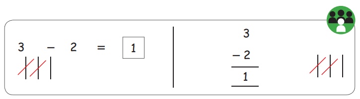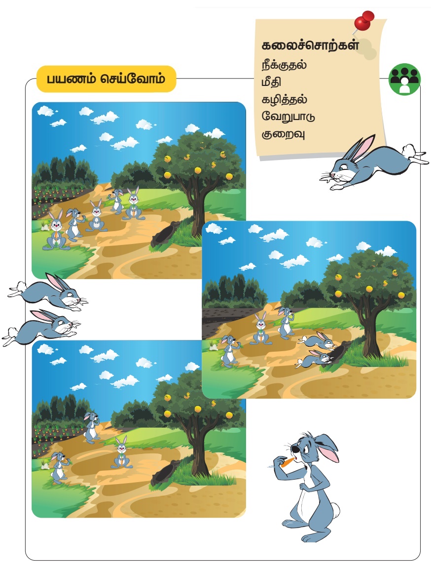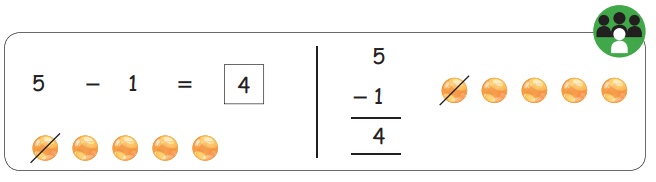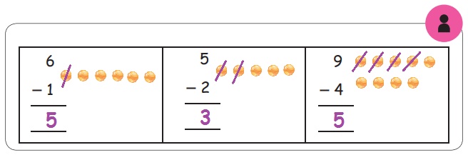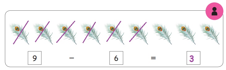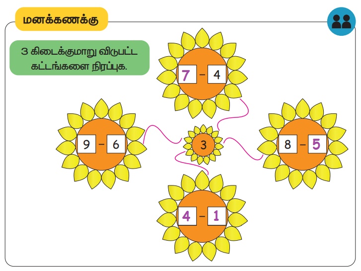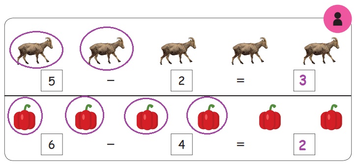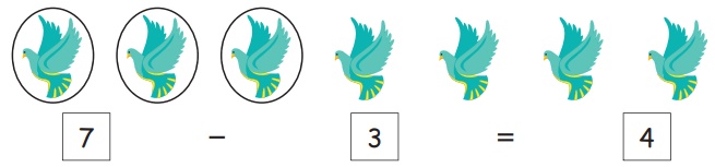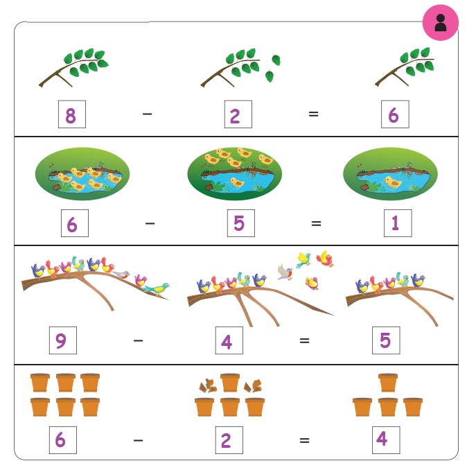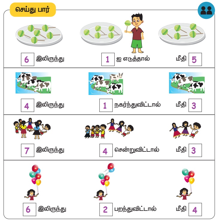மேற்கண்ட படங்களைக் கதையாக விவரித்து வேறுபாடு, குறைவு, நகர்ந்து விட்டால், சென்றுவிட்டல் போன்ற கழித்தலைக் குறிக்கும் சொற்களை வலுப்படுத்தலாம்.