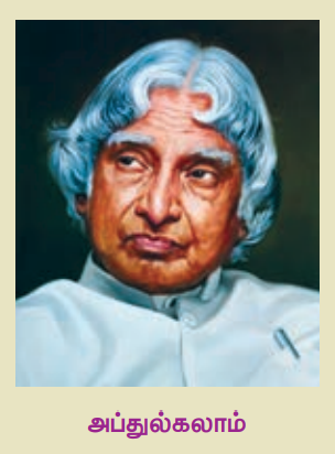 அப்துல்கலாம் இவர், இந்தியாவின் 11ஆவது குடியரசுத் தலைவராகப் பணியாற்றிய இந்திய அறிவியலாளர்; தமிழ் நாட்டின் இராமேசுவரத்தைச் சேர்ந்தவர்; ஏவுகணை, ஏவுகணை ஏவு ஊர்தித் தொழில்நுட்ப வளர்ச்சியில் கலாம் காட்டிய ஈடுபாட்டினால் இவர், 'இந்திய ஏவுகணை நாயகன்' என்று போற்றப்படுகின்றார்; பாதுகாப்பு ஆராய்ச்சி, மேம்பாட்டு நிறுவனத்திலும் இந்திய விண்வெளி ஆராய்ச்சி நிறுவனத்திலும் விண்வெளிப் பொறியாளராகப் பணியாற்றினார்; இந்தியாவின் உயரிய விருதான பாரதரத்னா விருது பெற்றவர். இவர் தம் பள்ளிக் கல்வியைத் தமிழ்வழியில் கற்றவர் என்பது குறிப்பிடத்தக்கது.