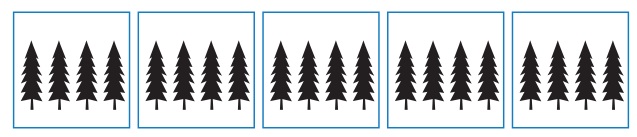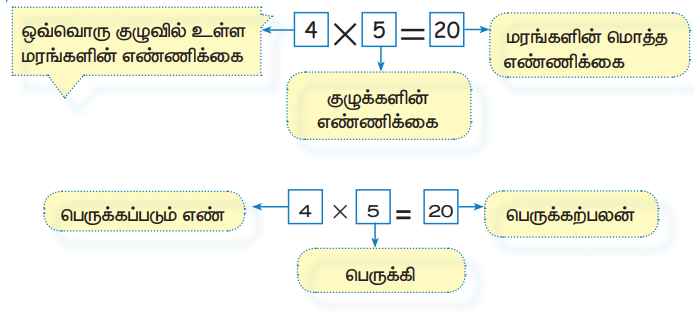 5 குழுக்களில் 4 மரங்கள் என மொத்தம் 20 மரங்கள் உள்ளன. இதனை நாம் 4 × 5 = 20 என எழுதலாம்.