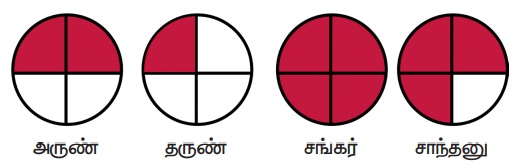 நான்கு சமபாகமாக பிரிக்கப்பட்ட வட்டத்தினை நான்கு மாணவர்களிடம் கொடுத்து வண்ணமடிக்குமாறு கூறப்பட்டது.