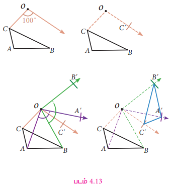 இங்கு ∆ABC ஆனது O வை பொருத்து 100° கோண அளவிற்குச் சுழற்றப்பட்டுள்ளது.