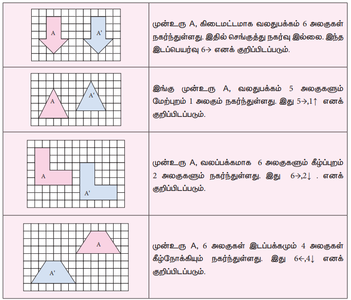 மேற்கண்ட எடுத்துக்காட்டுகளிலிருந்து உருவங்களின் அனைத்துப் புள்ளிகளும் ஒரே திசையிலும், ஒரே அளவிலும் நகர்ந்துள்ளதை நாம் காண இயலும்.
