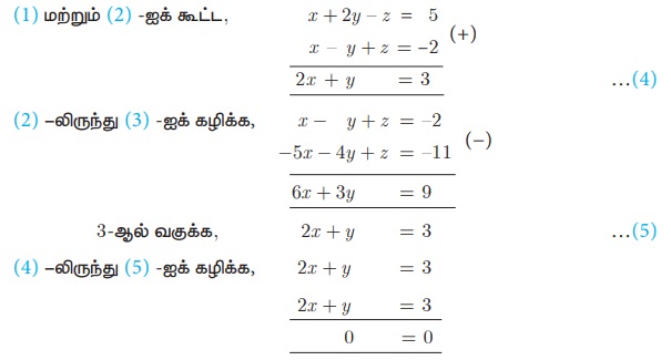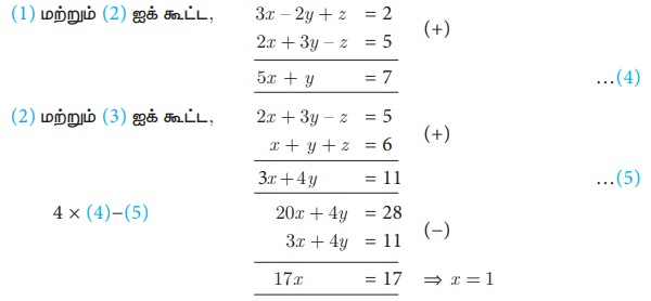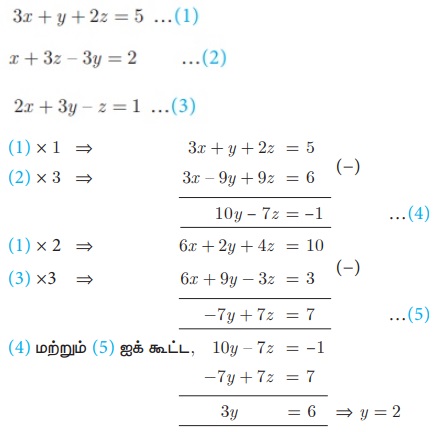 எடுத்துக்காட்டு, தீர்வு | இயற்கணிதம் - மூன்று மாறிகளில் அமைந்த நேரிய ஒருங்கமை சமன்பாடுகள் | 10th Mathematics : UNIT 3 : Algebra