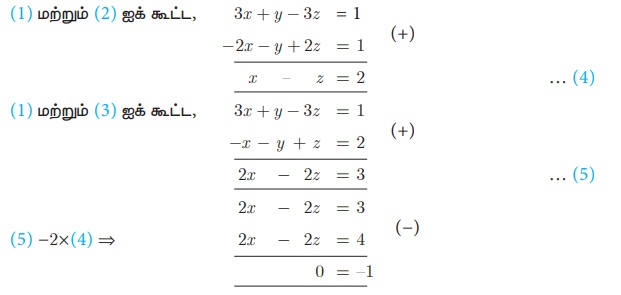 தீர்க்க 3x + y – 3z = 1; –2x – y + 2z = 1 ; –x – y + z = 2 .