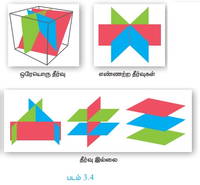 1. மூன்று மாறிகளில் அமைந்த ஒரு நேரிய சமன்பாட்டு தொகுப்பினைத் தீர்க்கும்போது கிடைக்கும் தீர்வுகளின் எண்ணிக்கை __________