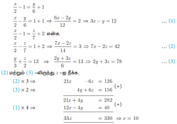 y = 2 என (5) -யில் பிரதியிட, − 14 + 7z = 7 ⇒ z = 3