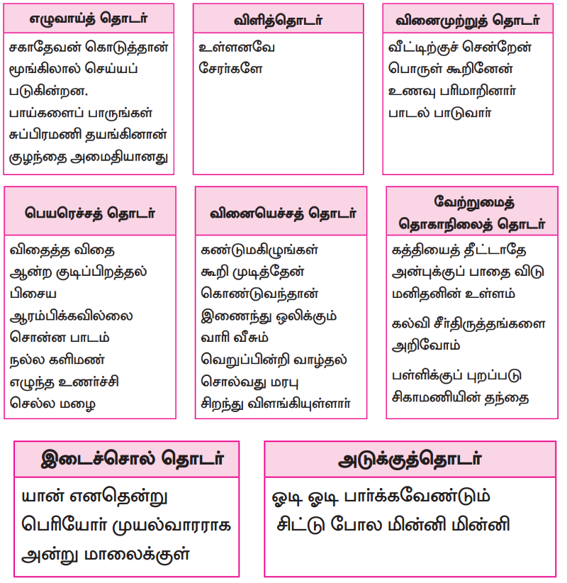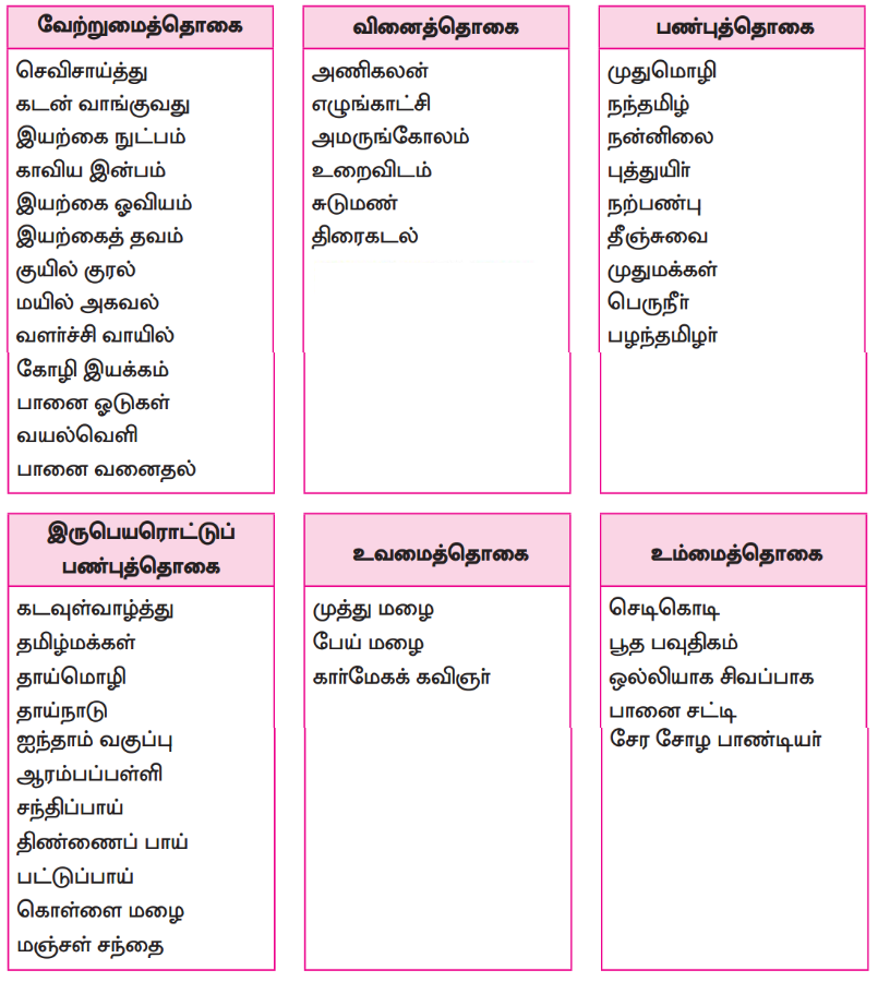 பாடப்பகுதியில் இடம்பெற்றுள்ள தொகைநிலைத் தொடர், தொகாநிலைத் தொடர்களைக் கண்டறிந்து தனித்தனியே தொகுக்க.
