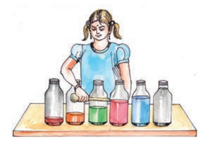. உணவுப் பொருளுக்குப் பயன்படுத்தப்படும் வண்ணப் பொடியை தண்ணீரில் கலந்து கொண்டு, ஒவ்வொரு புட்டியிலும் வேறுபட்ட அளவில் தண்ணீர் நிரப்பியிருப்பதை அறிந்துகொள் (பார்த்துக்கொள்)